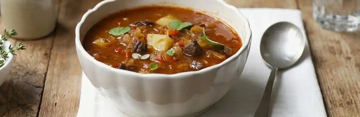 Traditional beef goulash soup with onions and paprika, served with bread.